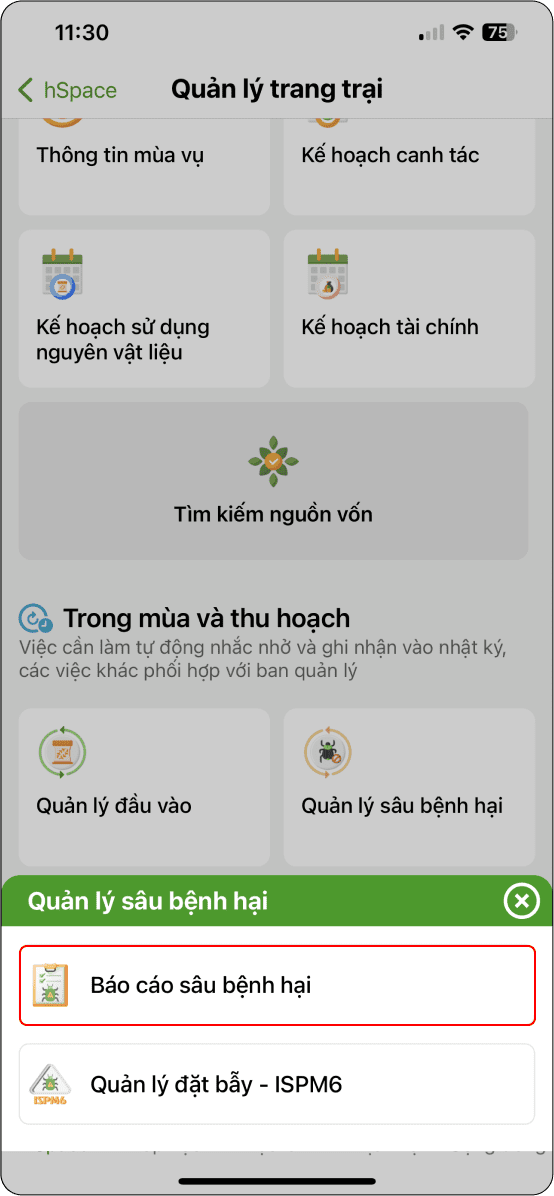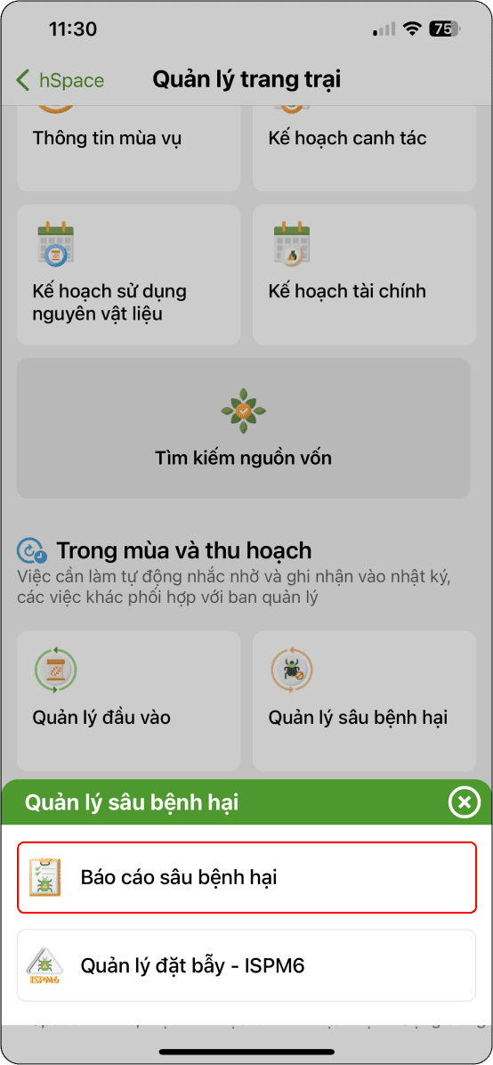 Chọn “Quản lý sâu bệnh” (Hình 1) → Quản lý đặt bẫy - ISPM 06 (Hình 2) → Danh sách bẫy được đặt tại vườn (Hình 3).