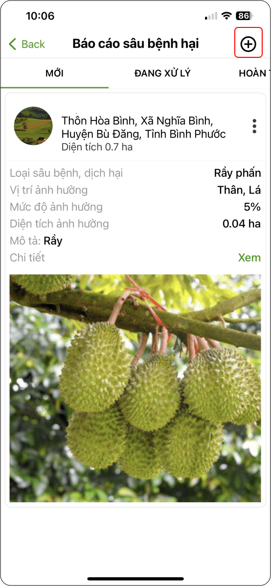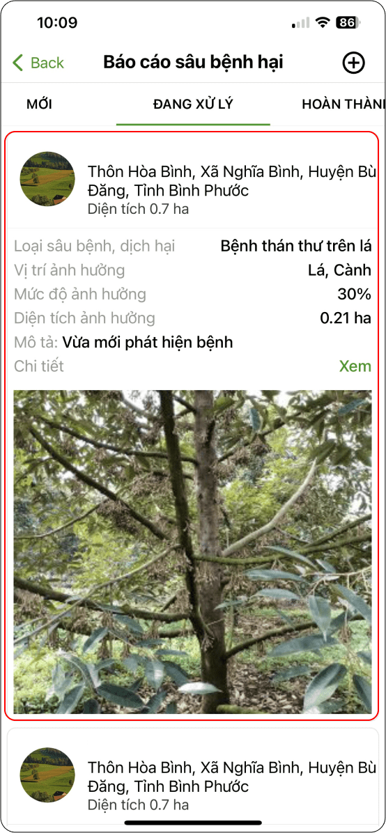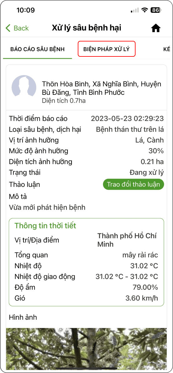 Tại màn hình “Báo cáo sâu bệnh” người dùng chọn trạng thái đang xử lý (Hình 1) → Chọn xem chi tiết báo cáo sâu bệnh (Hình 1) → chọn “Biện pháp xử lý” (Hình 2) → Nông dân nhận và thực hiện công việc xử lý (Hình 3).