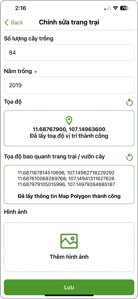 → Nông hộ thực hiện cập nhật thông tin trang trại (Hình 4) → Chọn “Lưu” để hoàn thành cập nhật (Hình 4).