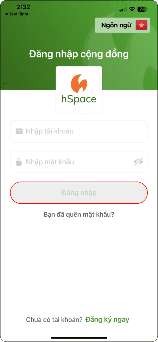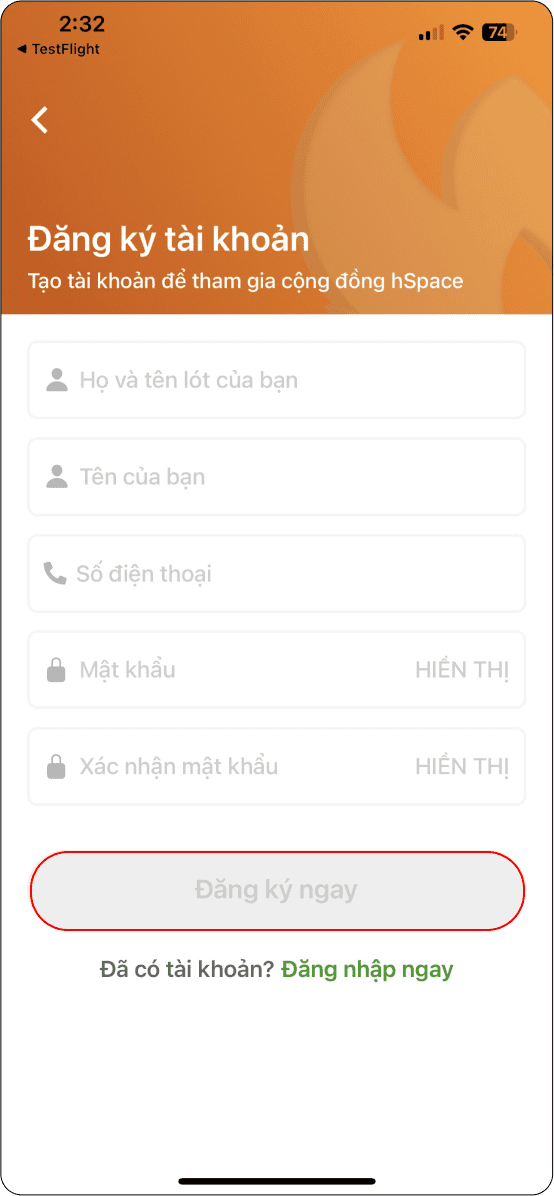 Truy cập ứng dụng hSpace và chọn “Đăng ký” (Hình 1)