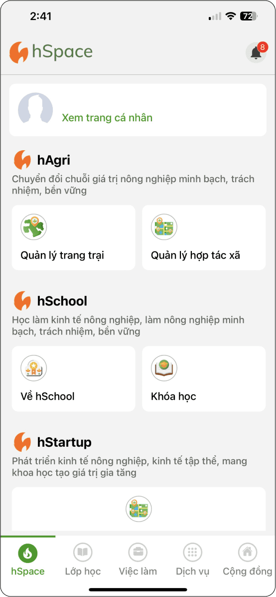 Đối với nhóm tham gia liên kết cơ sở hStartup, hệ thống tự động đề xuất các nhóm cơ sở tại địa phương của nông hộ do nông hộ cung cấp khi đăng ký trang trại. Để tham gia nhóm cơ sở, nông hộ thực hiện các bước sau: