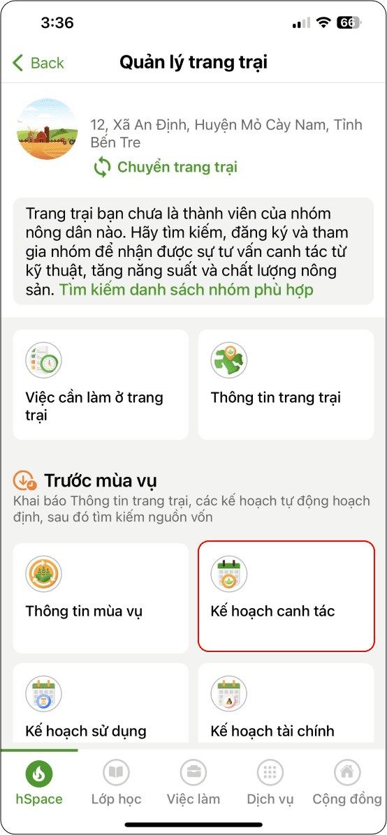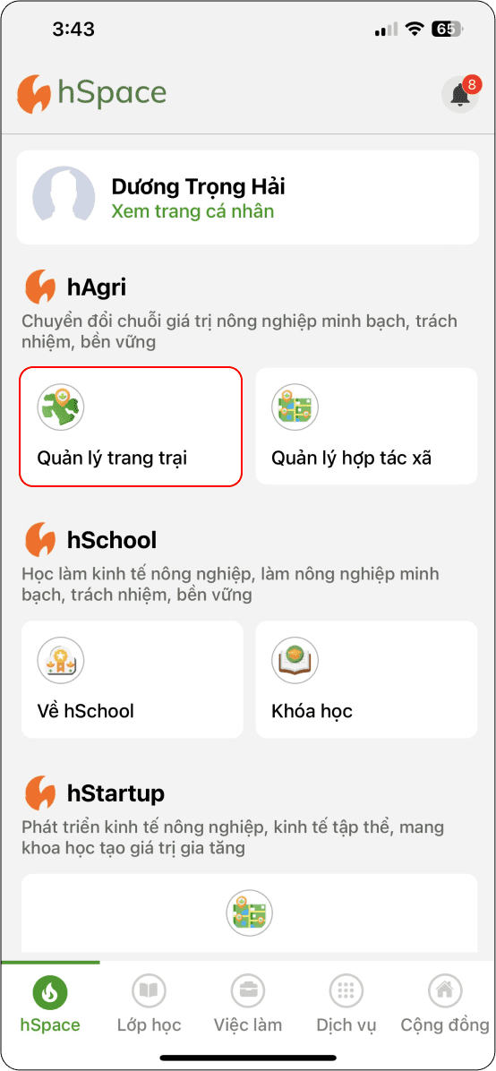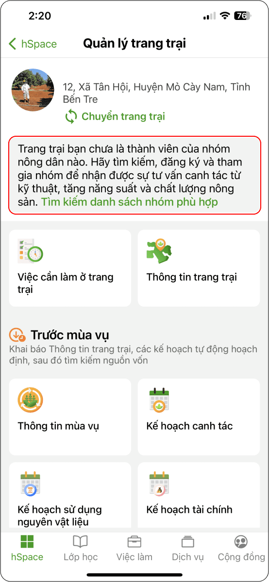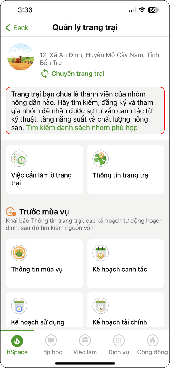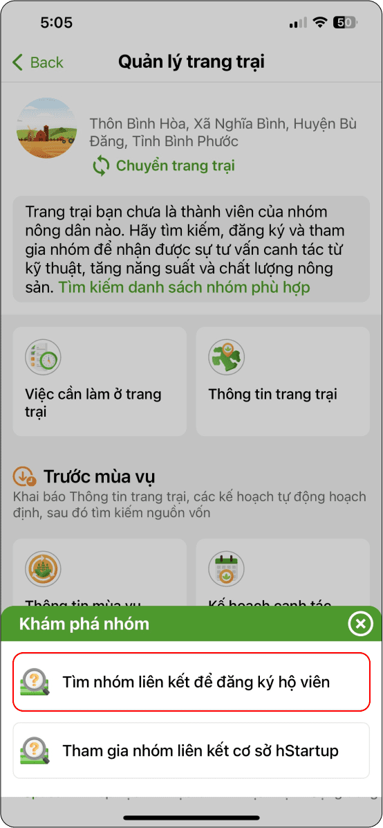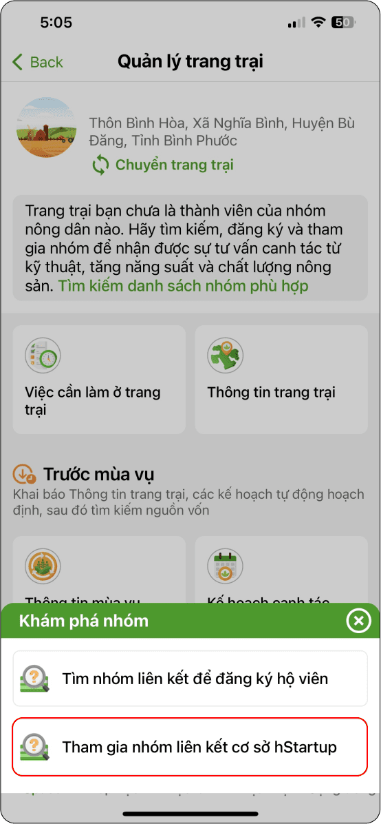 Tại màn hình “Quản lý trang trại” (Hình 1) → Chọn phần nhắc nhở tham gia nhóm (Hình 1) → Chọn “tham gia nhóm liên kết cơ sở hStartup” (Hình 2) → Hệ thống hiển thị nhóm cơ sở tại địa phương (Hình 3).