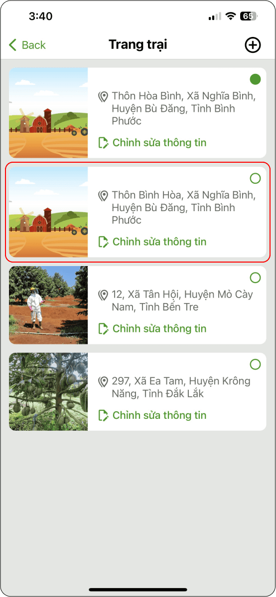 Người dùng sau khi truy cập Quản lý trang trại → Chọn Thông tin trang trại (Hình 1). → Chọn biểu tượng đa nhiệm (Hình 2) → Tiếp tục chọn Cập nhật thông tin trang trại (Hình 3).