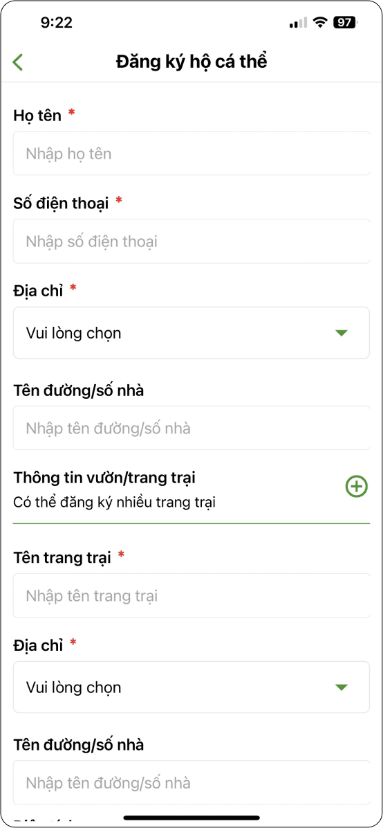 Tại màn hình Quản lý trang trại → Chọn Chuyển trang trại → Chọn biển tượng “+” → Nhập thông tin theo yêu cầu tương tự như đăng ký định danh trang trại.