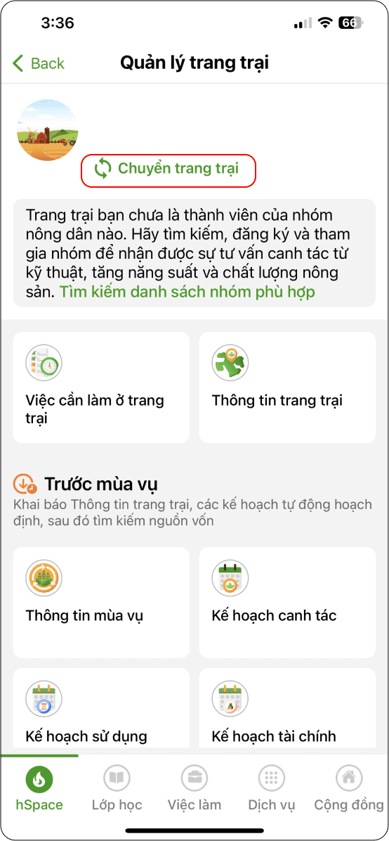 Tại màn hình Quản lý trang trại → Chọn Chuyển trang trại → Chọn trang trại muốn chuyển trên danh sách.