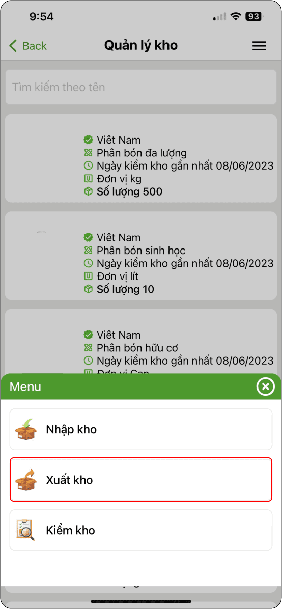 Tại màn hình “Quản lý kho” của nông hộ (Hình 1) → Chọn biểu tượng đa nhiệm (Hình 1) → Chọn “Xuất kho” (Hình 2) → Hiển thị màn hình danh sách chứng từ xuất kho (Hình 2) → Chọn vào chứng từ trên danh sách để xem chi tiết (Hình 3).