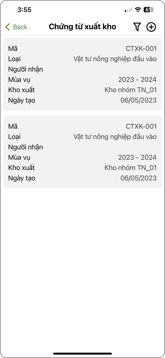 Nông dân sẽ tạo chứng từ nhập kho khi mua hoặc nhập vật tư mới vào khi sau khi đã khai báo vật tư đầu vào. Số lượng vật tư mới khi tạo chứng từ nhập kho sẽ được cộng vào số lượng vật tư đó trong kho.