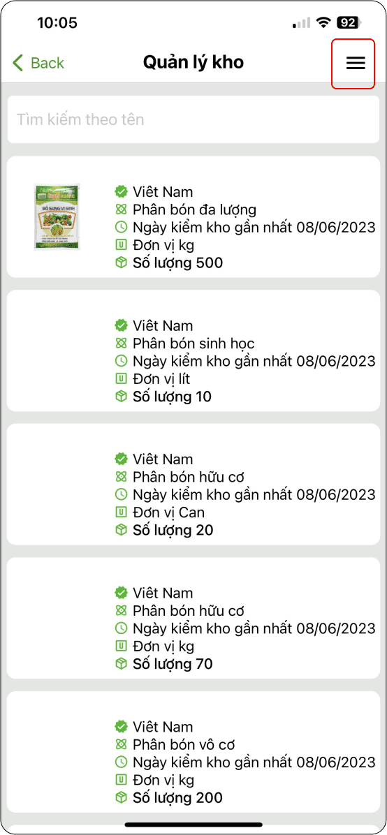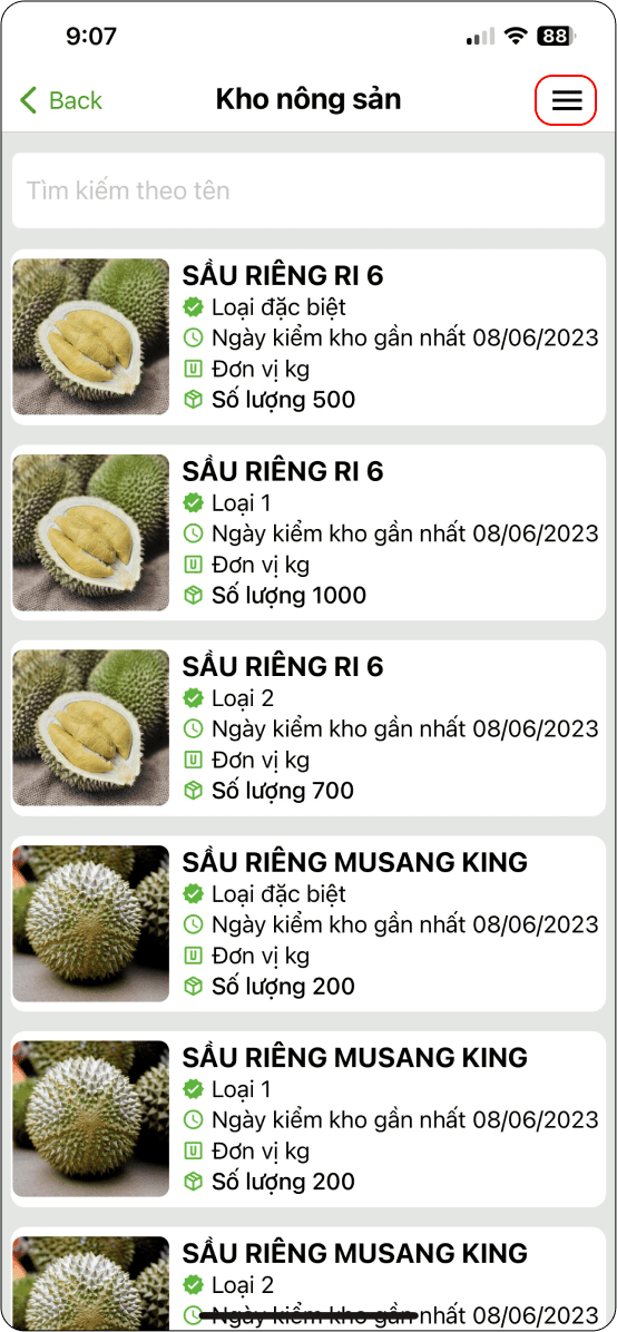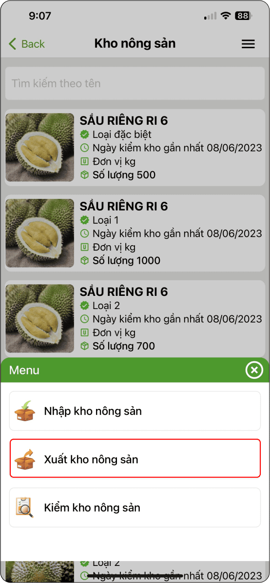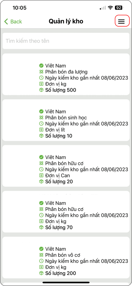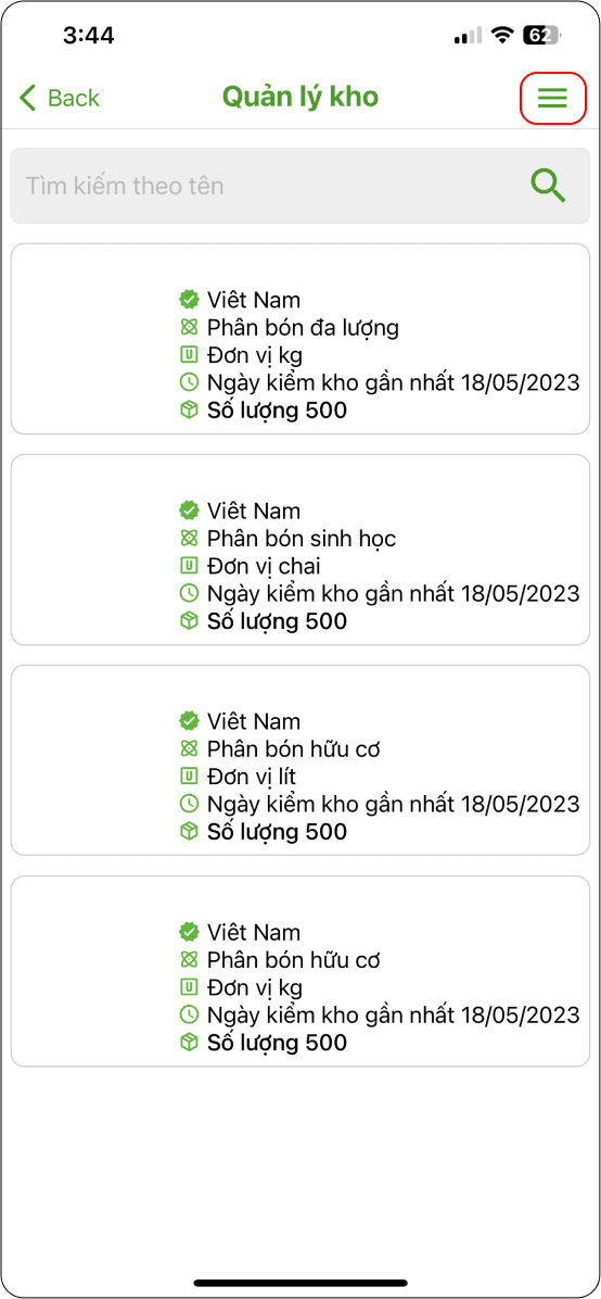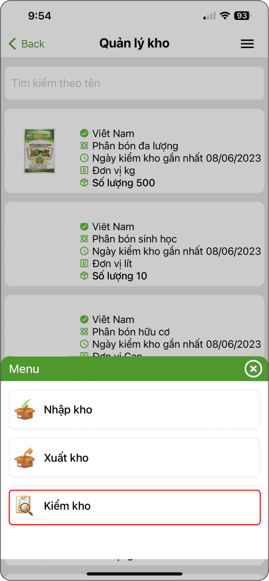 Kiểm kho giúp trang trại kiểm soát tốt nông sản cũng như hoạt động buôn bán của mình, nắm bắt kịp thời chất lượng nông sản còn trong kho. Nông hộ thực hiện kiểm kho và cập cập nhật số lượng tồn kho như sau:Tại màn hình “Kho nông sản” (Hình 1) → Chọn biểu tượng đa nhiệm (Hình 1) → Chọn “Kiểm kho nông sản ” (Hình 2) → Hiển thị Danh sách tồn kho nông sản và số lượng tồn kho (Hình 3).