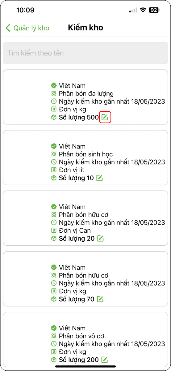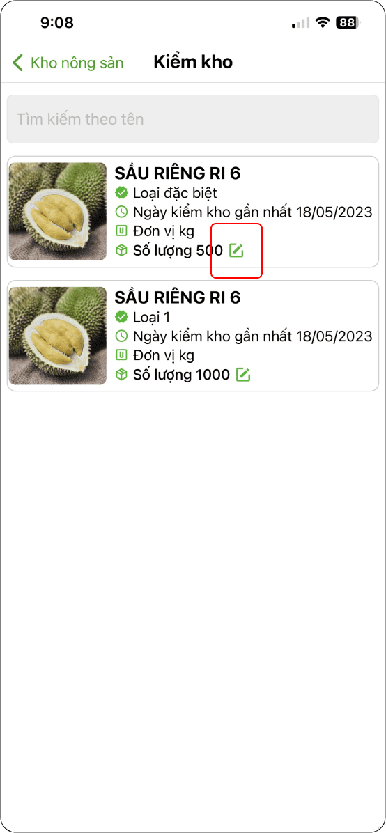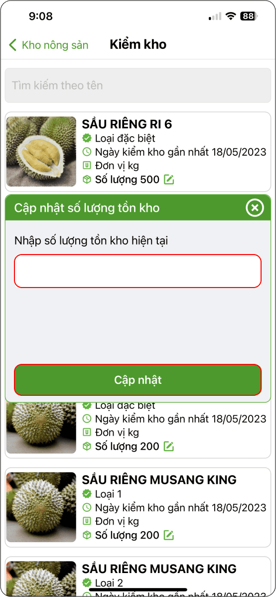 Tiếp tục chọn biểu tượng chỉnh sửa tại nông sản muốn cập nhật sản lượng (Hình 3) → Nhập sản lượng đã kiểm kho (Hình 4) → Cập nhật. Hoàn thành cập nhật tồn kho (Hình 4).