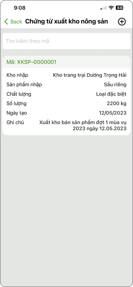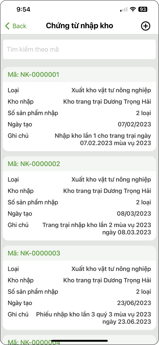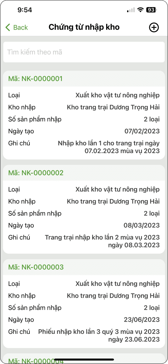 Tất cả các chứng từ nhập - xuất kho đều được hệ thống lưu trữ và cung cấp thông tin truy xuất nguồn gốc của trạng trại.