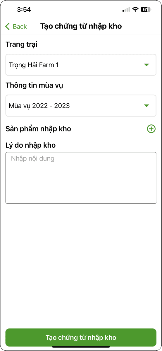 Khi nhập vật tư cho trang trại mới nông hộ sẽ tạo chứng từ nhập kho cho trang trại của mình: