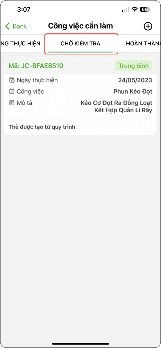 - Nếu công việc cần kỹ thuật kiểm tra thì → chuyển qua trạng thái “Chờ kiểm tra” (Hình 9).