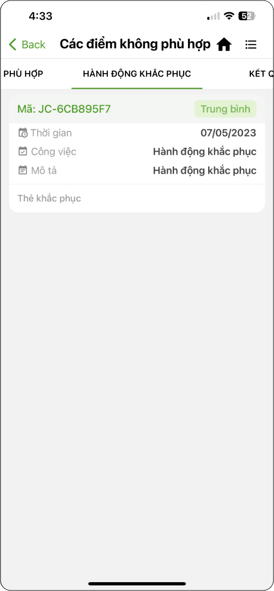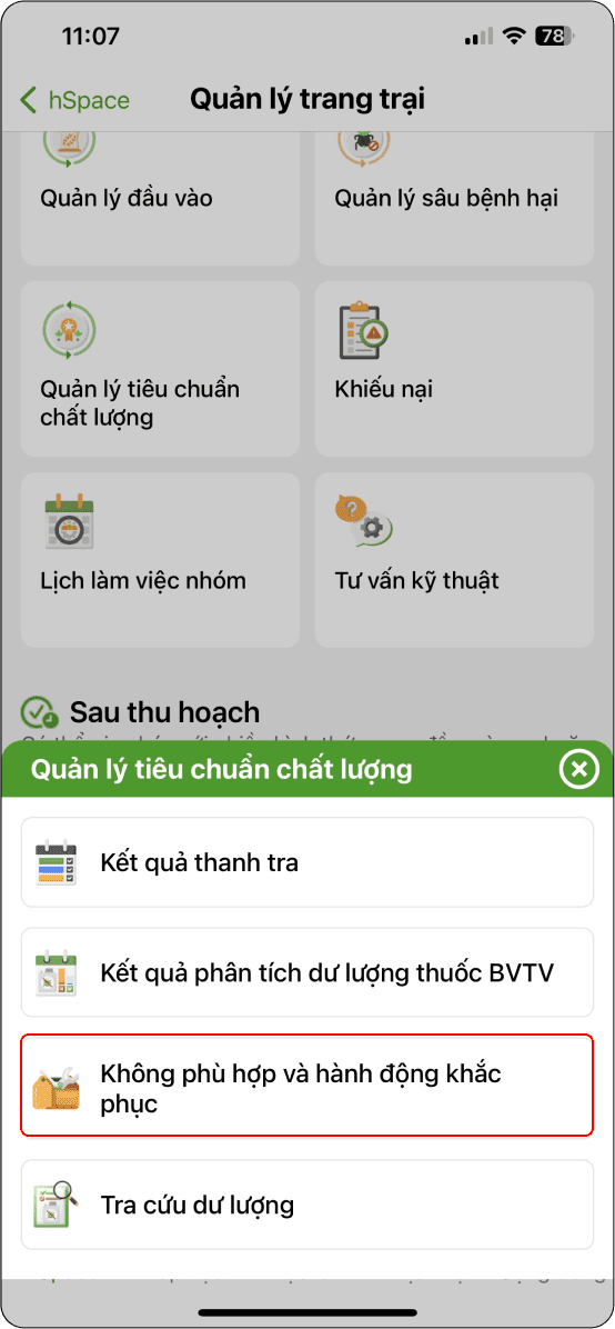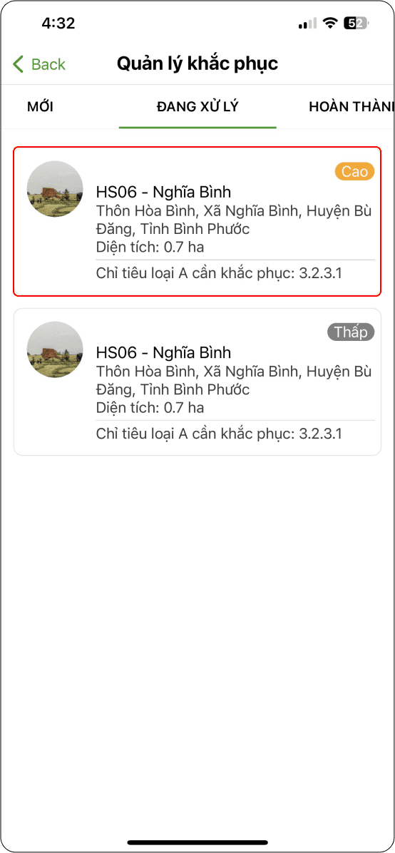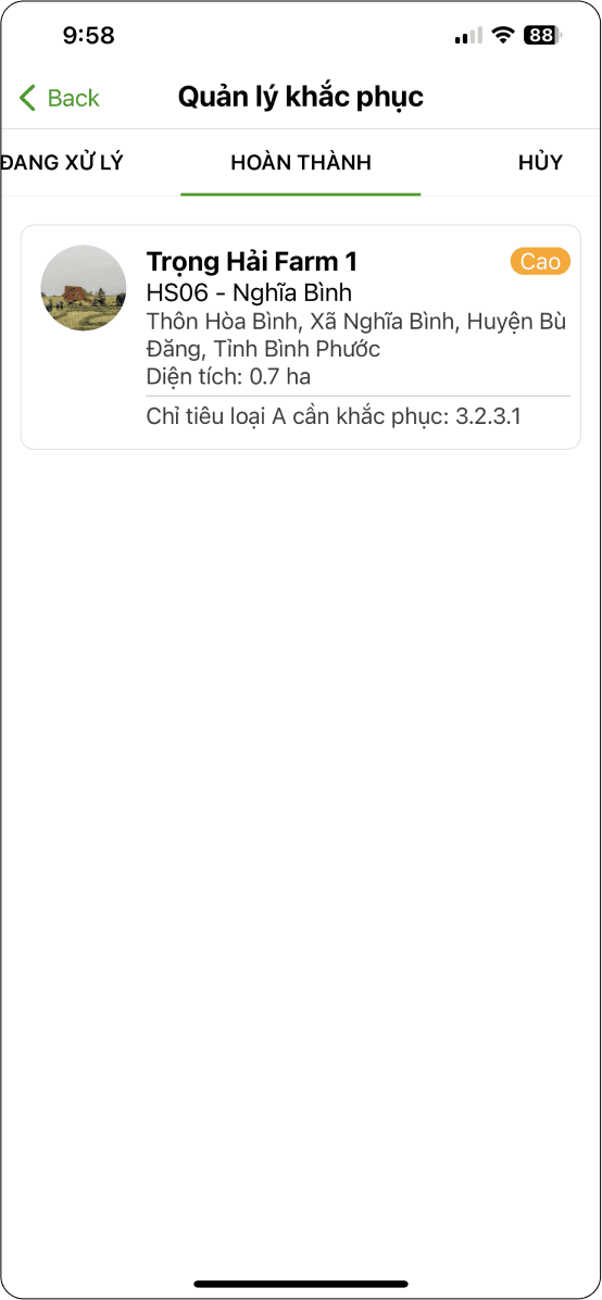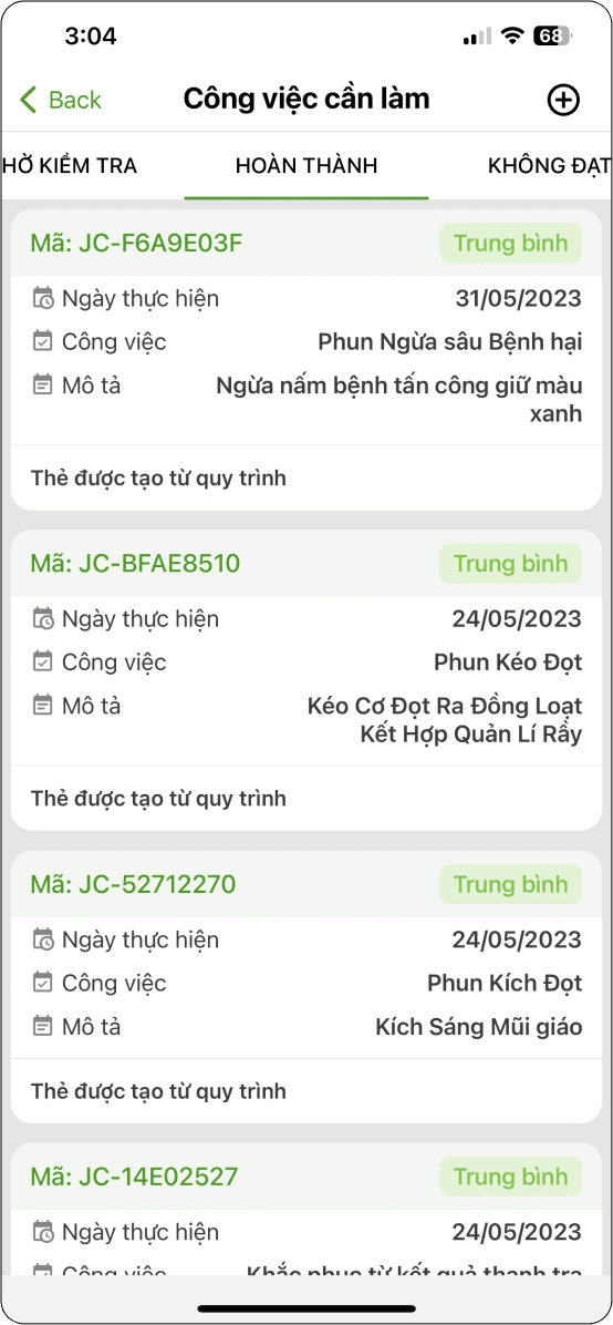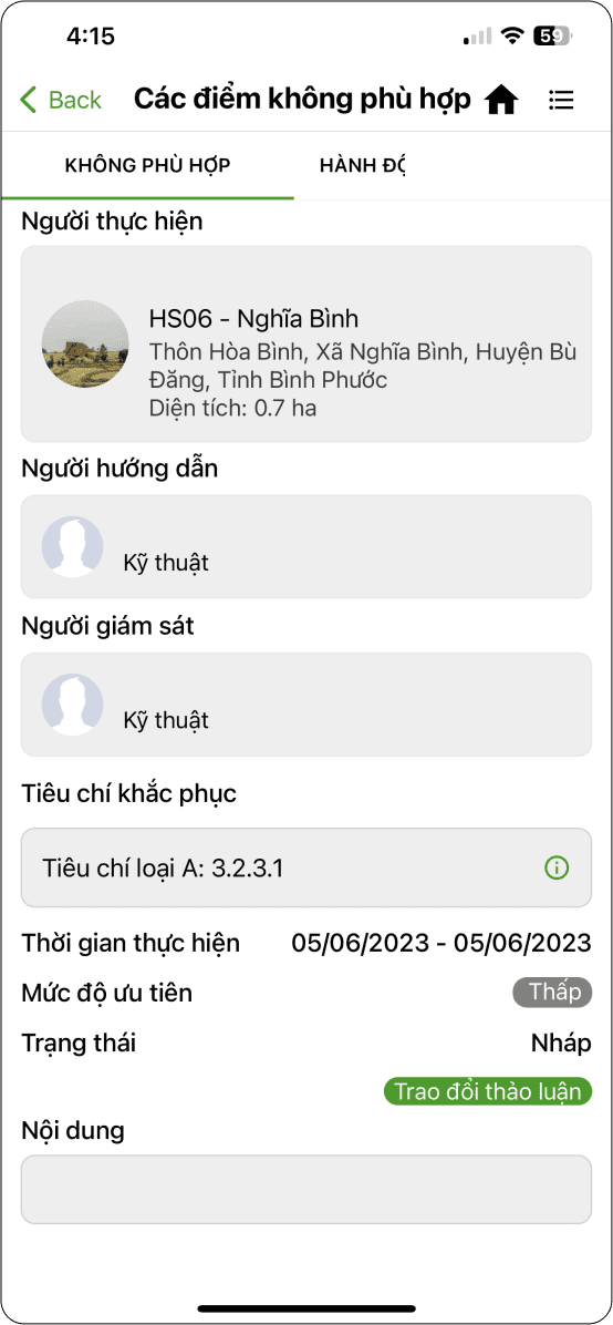 - Nếu không đạt điều kiện → Kết quả công việc được lưu lại → Thẻ công việc khắc phục tiếp tục được tạo và gửi đến nông hộ thực hiện nhằm đảm bảo kết quả hoàn thành cho đến khi đạt kết quả yêu cầu.