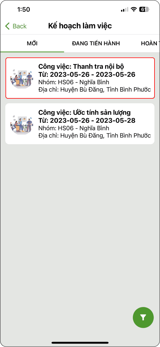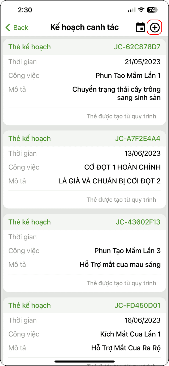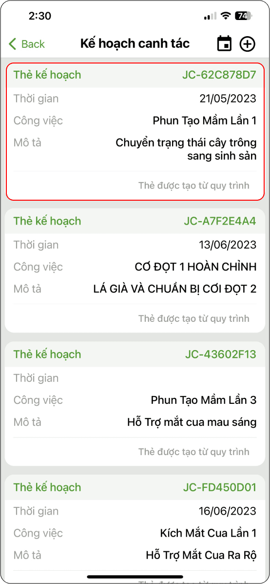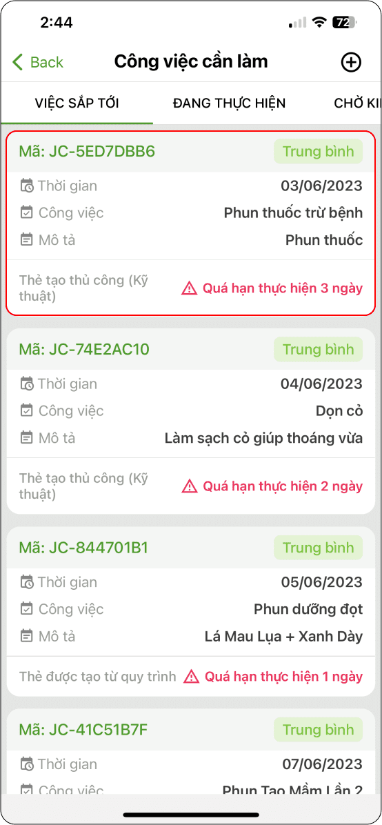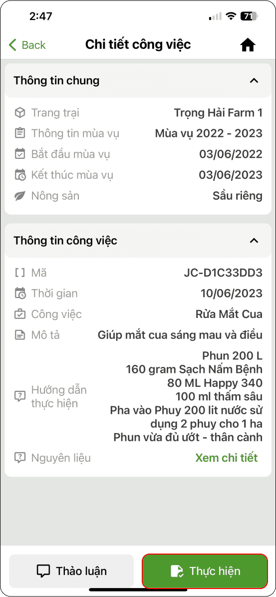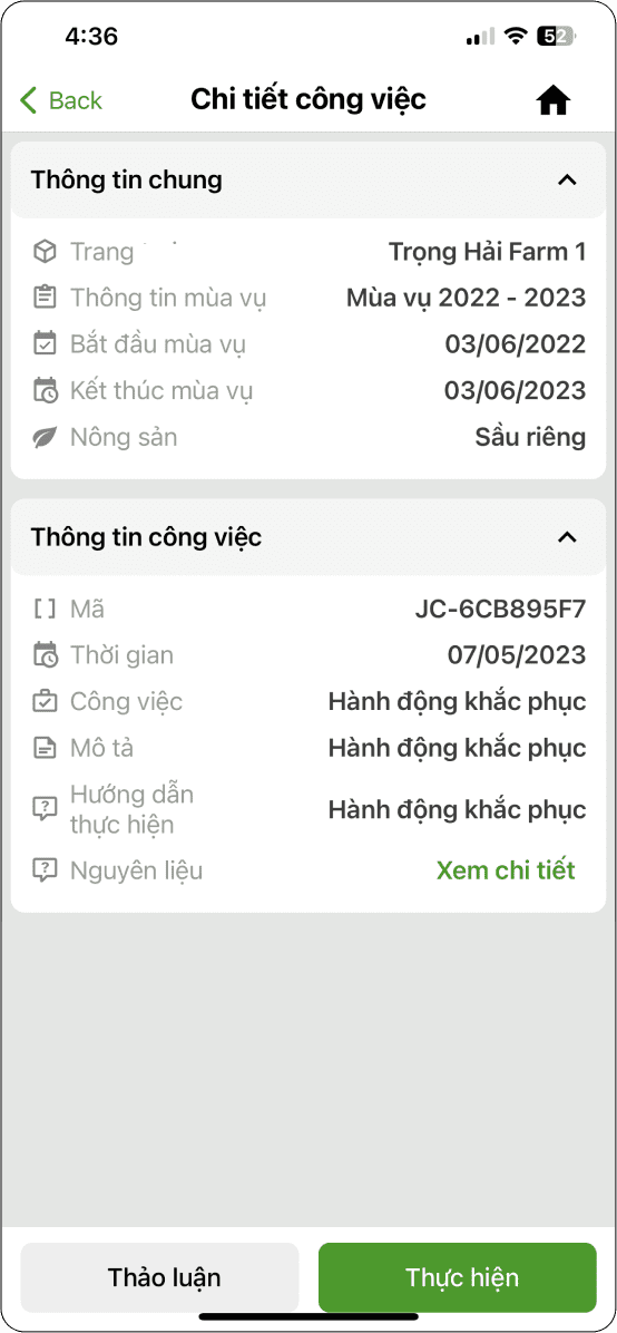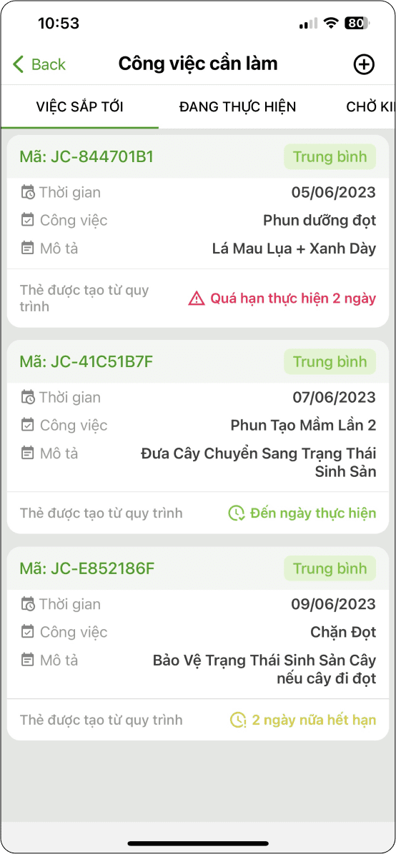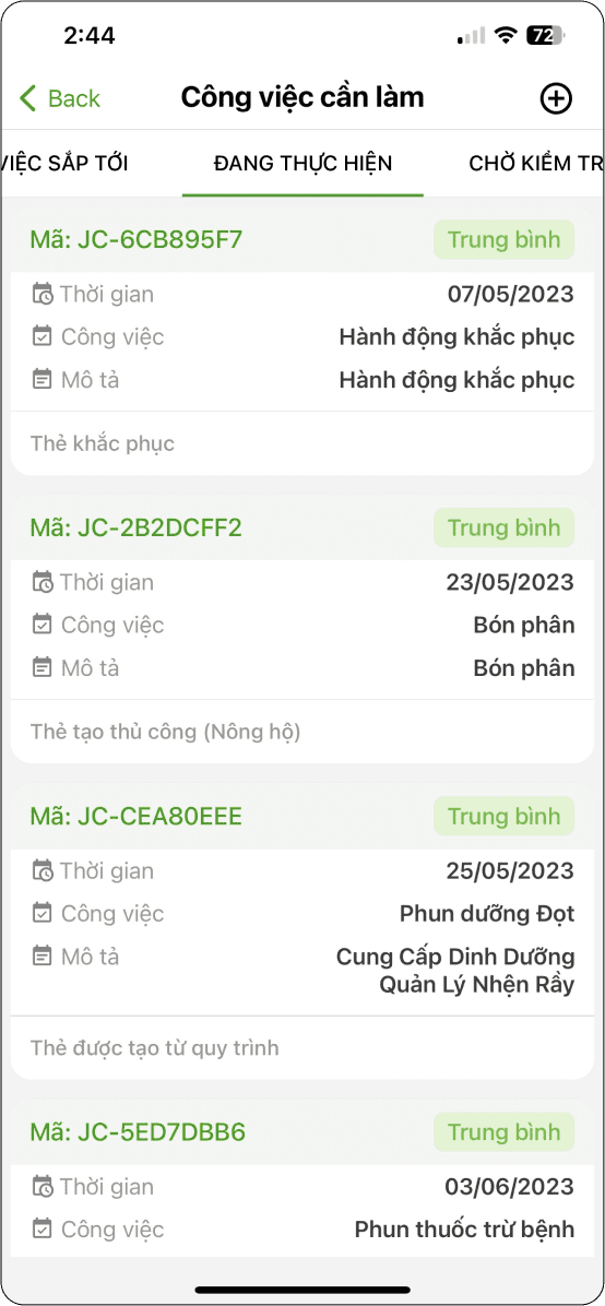 Khi kế hoạch canh tác đến ngày thực hiện, thẻ công việc được sinh ra và giao đến trang trại nông dân. Nông dân nhận việc và thực hiện công việc, các công việc được lưu lại thành nhật ký canh tác, phục vụ cho truy xuất nguồn gốc.