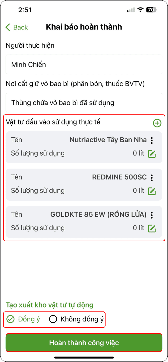 - Nếu trong công việc có sử dụng vật tư đầu vào, hệ thống hiển thị bảng sử dụng vật tư đầu vào, nông hộ có thể chỉnh sửa số lượng theo thực tế sử dụng (Hình 9).