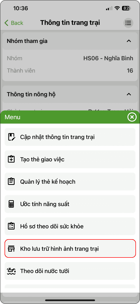 Truy cập “Thông tin trang trại ” (Hình 1) → Chọn biểu tượng đa nhiệm (Hình 2) → Chọn “Kho lưu trữ hình ảnh trang trại” (Hình 3) → Hiển thị hình ảnh trang trại (Hình 4).