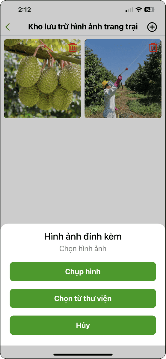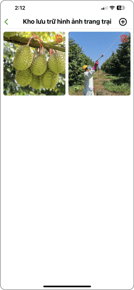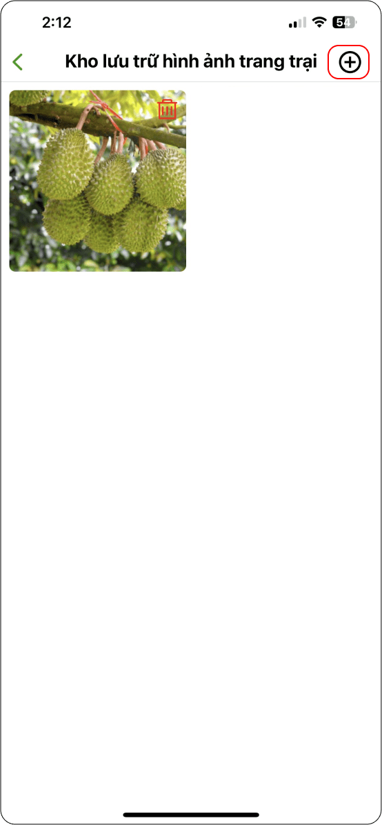 Tại màn hình Kho lưu trữ hình ảnh trang trại → Chọn biểu tượng dấu “+” (Hình 1) → Thêm hình ảnh từ thiết bị. Hoàn thành thêm hình ảnh vào kho lưu trữ (Hình 2 và 3).
