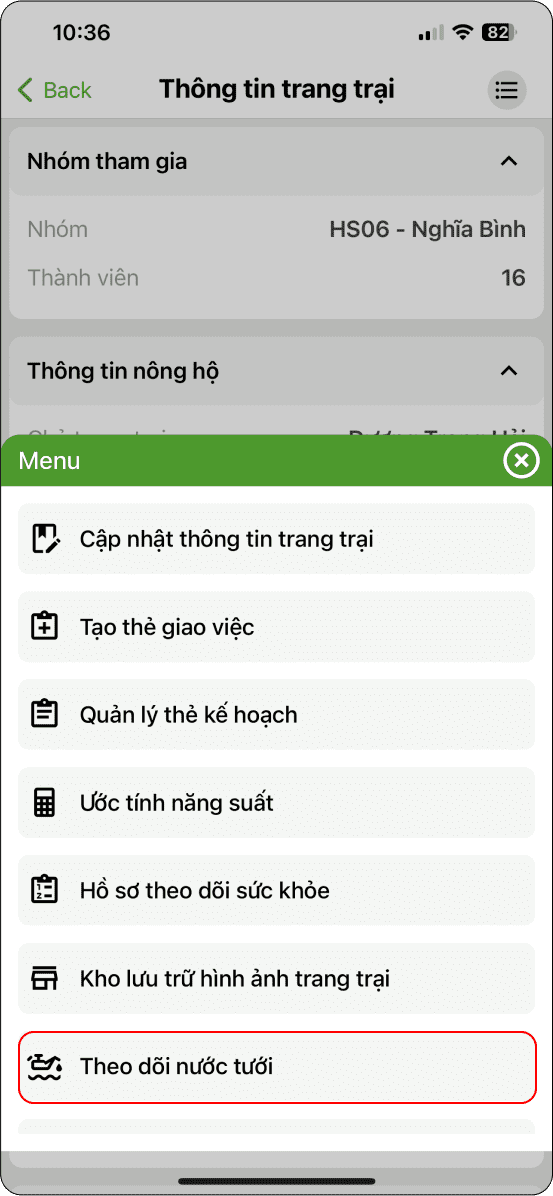 Truy cập “Thông tin trang trại ” (Hình 1) → Chọn biểu tượng đa nhiệm (Hình 2) → Chọn “Theo dõi nước tưới” (Hình 3) → Hiển danh sách các đợt tưới nước trang trại (Hình 4).