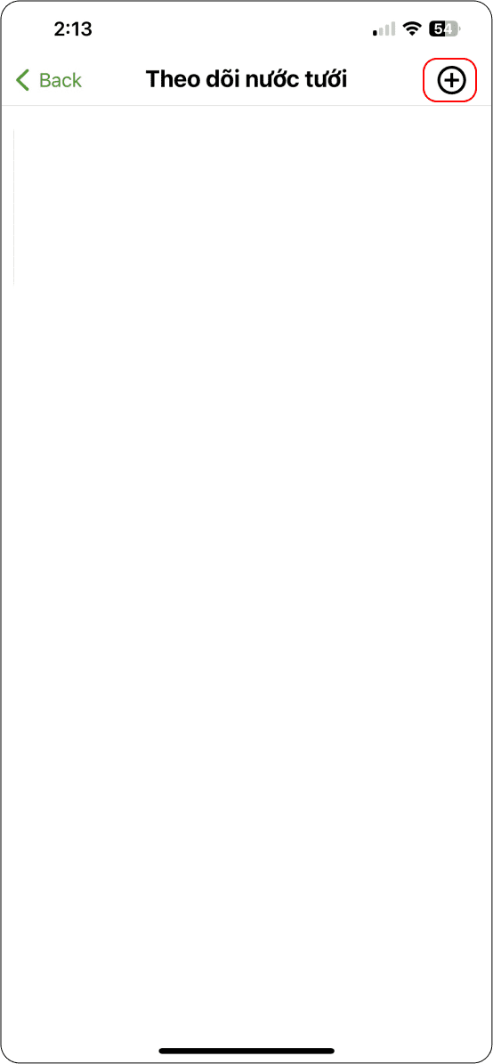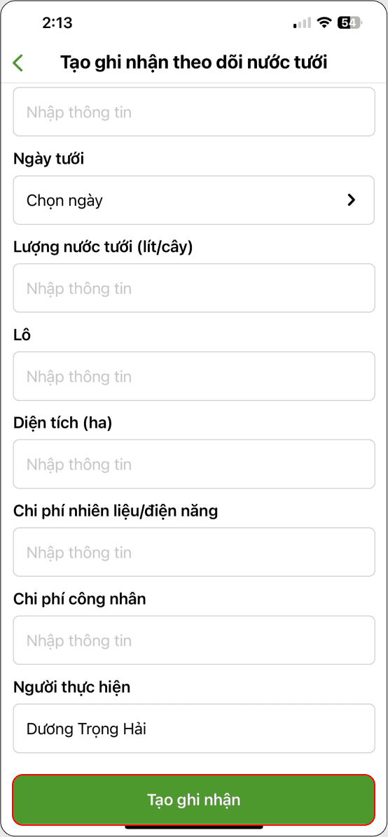 Tại màn hình Theo dõi nước tưới → Chọn biểu tượng dấu “+” (Hình 1) → Nhập thông tin đợt tưới (Hình 2) → Tạo ghi nhận (Hình 3). Hoàn thành tạo ghi nhận.