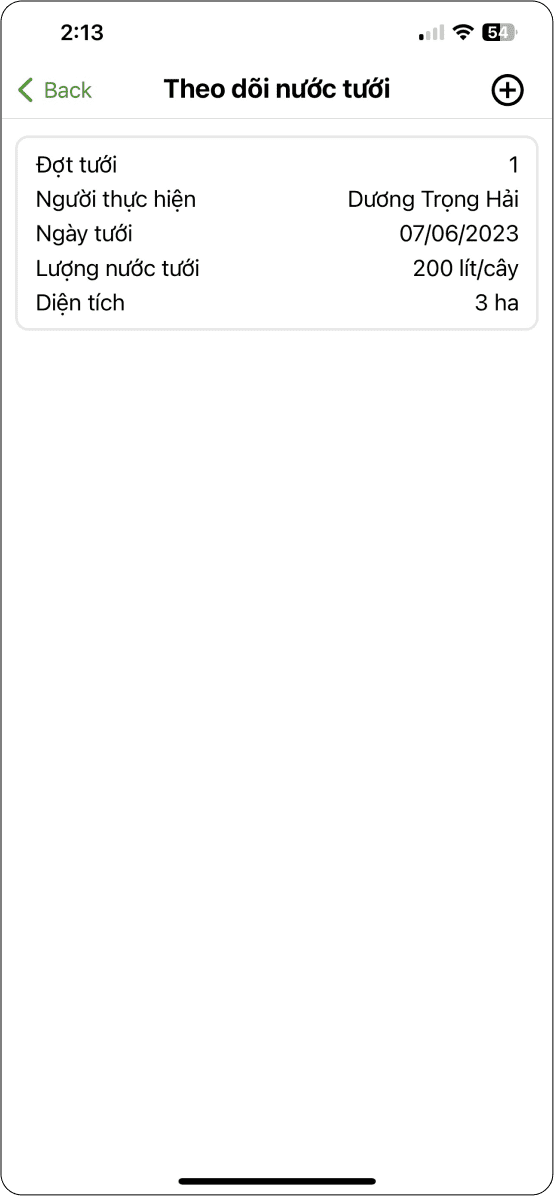 Theo dõi tưới nước giúp nông hộ lưu lại thông tin chi tiết của công việc tưới nước tại trang trại: lượng nước tưới, tiền nhân công, đợt tưới,... từ đó đưa thông tin vào nhật ký canh tác của trang trại cung cấp đầy đủ cho hồ sơ mã số vùng trồng.