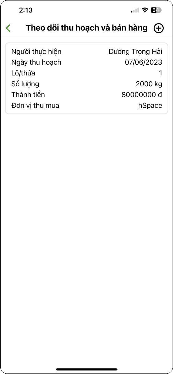 Tại màn hình Theo dõi thu hoạch và bán hàng → Chọn biểu tượng dấu “+” (Hình 1) → Nhập thông tin thu hoạch và bán hàng (Hình 1) → Tạo ghi nhận (Hình 3). Hoàn thành tạo ghi nhận.