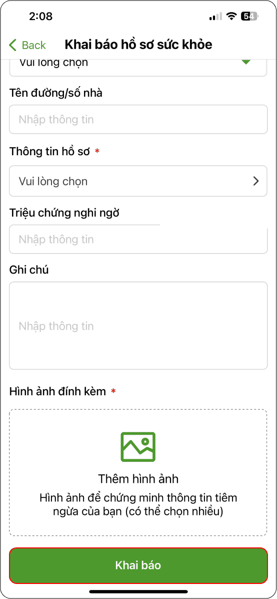 Để khai báo hồ sơ sức khỏe thực hiện: