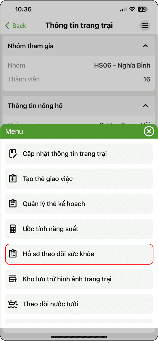 Truy cập “Thông tin trang trại ” (Hình 1) → Chọn biểu tượng đa nhiệm (Hình 2) → Chọn “Hồ sơ theo dõi sức khỏe” (Hình 3) → Hiển thị danh sách hồ sơ sức khỏe của người lao động tại trang trại (Hình 4).