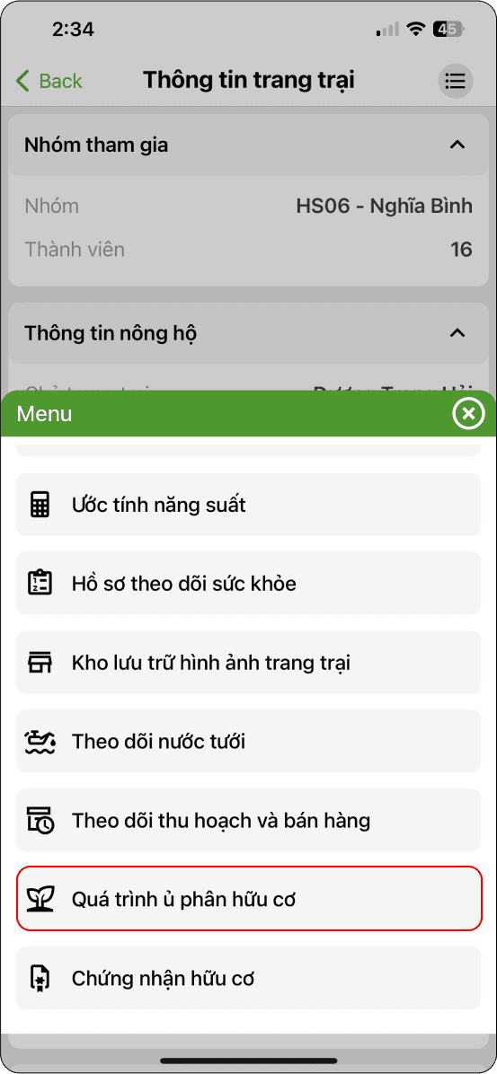 Truy cập “Thông tin trang trại ” → Chọn biểu tượng đa nhiệm (Hình 1) → Chọn “Quá trình ủ phân hữu cơ” (Hình 2) → Hiển danh sách quá trình ủ phân hữu cơ của trang trại (Hình 3).