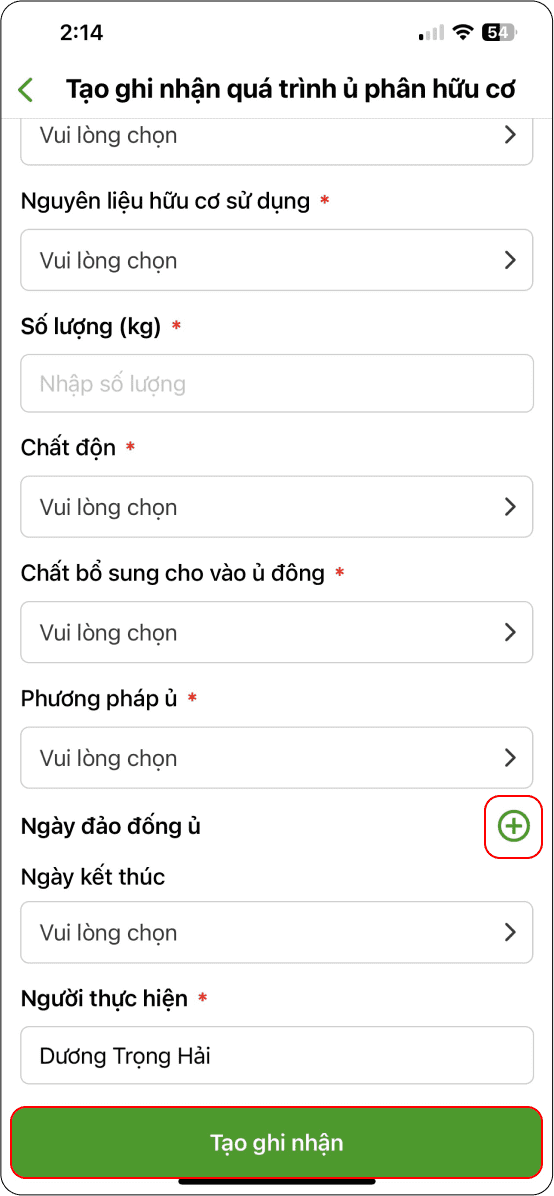 → Sau khi nhập hoàn thành các thông tin trên chọn “Tạo ghi nhận” (Hình 2) → Hoàn thành ghi nhận quá trình tạo ủ phân hữu cơ (Hình 4).