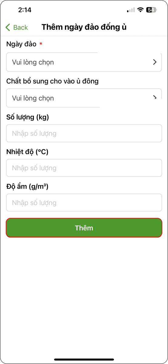 Tại màn hình “Quá trình ủ phân hữu cơ” → Chọn biểu tượng dấu “+” (Hình 1) để khai báo quá trình ủ phân → Nhập thông tin quá trình và nguyên liệu sử dụng (Hình 2) → Chọn biểu tượng dấu “+” để ghi nhận ngày đảo đống ủ (Hình 2) → Nhập thông tin yêu cầu (Hình 3) → Thêm (Hình 3).