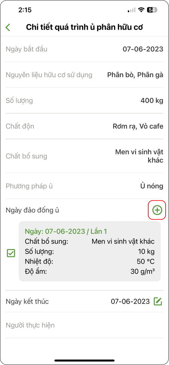 Truy cập Quá trình ủ phân hữu cơ → Chọn quá trình muốn thêm ghi nhận (Hình 1) → Chọn biểu tượng dấu “+” để ghi nhận ngày đảo đống ủ (Hình 2) → Nhập thông tin yêu cầu → Thêm (Hình 3). Hoàn thành thêm ghi nhận ngày đảo ủ đống.