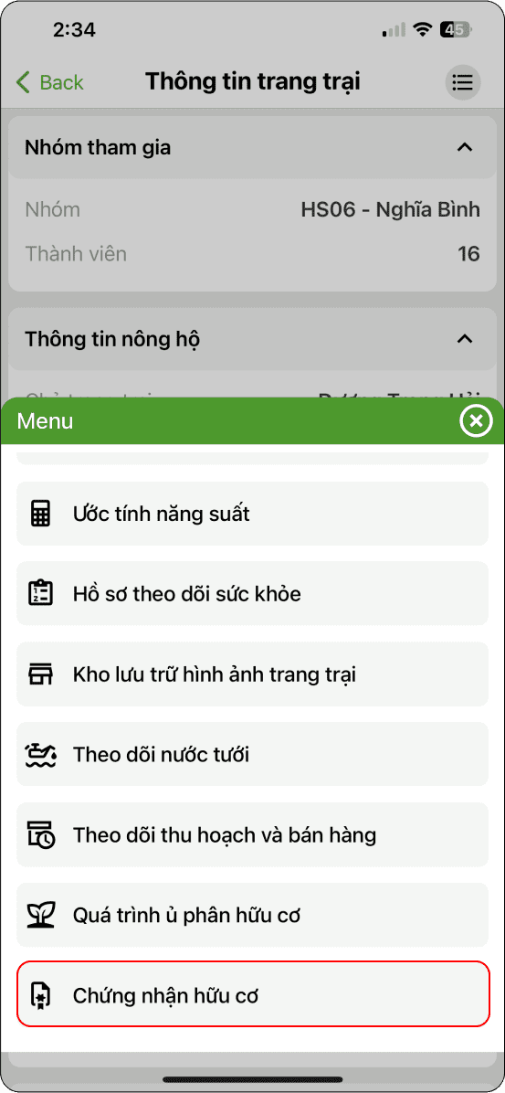 Truy cập “Thông tin trang trại ” (Hình 1) → Chọn biểu tượng đa nhiệm (Hình 2)→ Chọn “Chứng nhận hữu cơ” (Hình 3) → Hiển danh sách chứng nhận của trang trại (Hình 4).