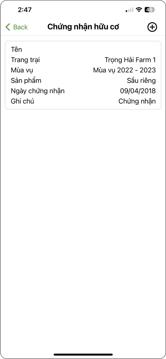 Chứng nhận hữu cơ được hiển thị trên truy xuất nguồn gốc của trang trại, mục Chứng nhận hữu cơ.