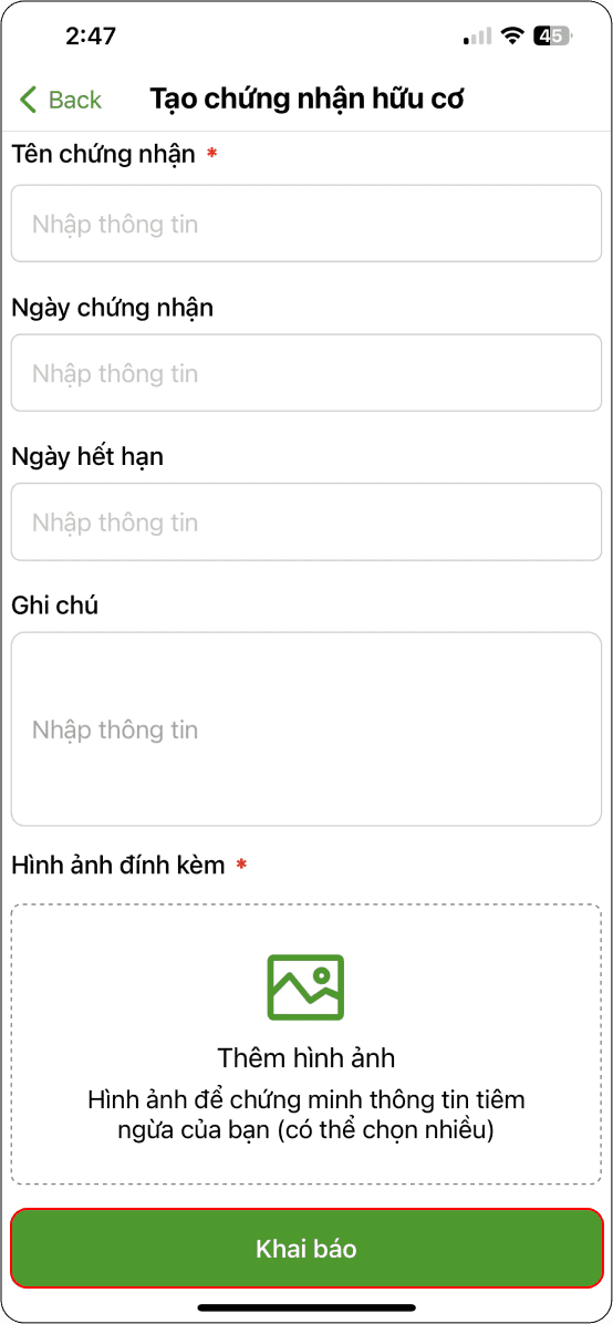 Tại màn hình Chứng nhận hữu cơ → Chọn biểu tượng dấu “+” (Hình 1) → Nhập thông tin yêu cầu (Hình 2) → Khai báo (Hình 2). Hoàn thành tạo chứng nhận hữu cơ (Hình 3).