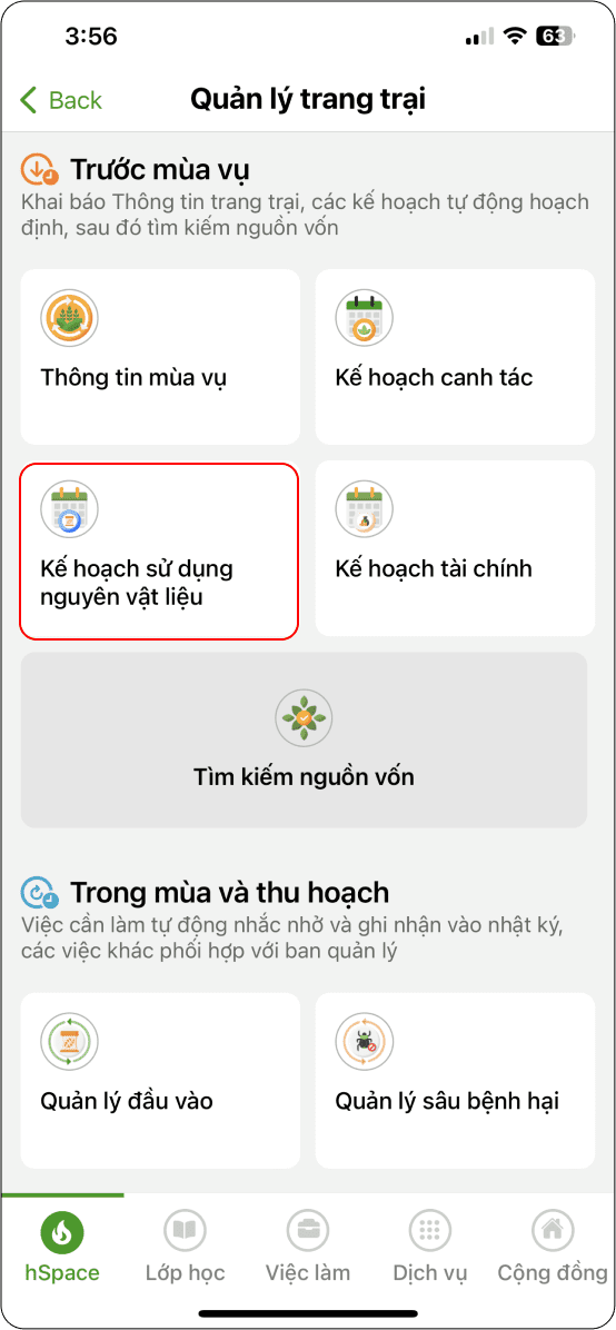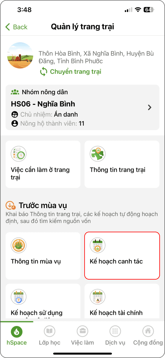 Tại màn hình quản lý trang chọn “Kế hoạch canh tác” (Hình 1) → Hiển thị danh sách kế hoạch canh tác của trang trại (Hình 2) → Chọn trực tiếp vào thẻ kế hoạch muốn xem (Hình 2).