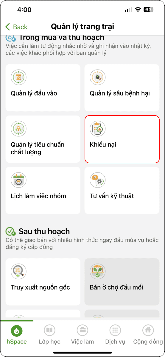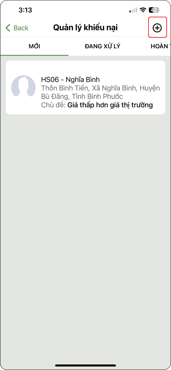 Tại màn hình Quản lý trang trại → Chọn “Khiếu nại” (Hình 1) → Ấn chọn biểu tượng dấu cộng (Hình 2).