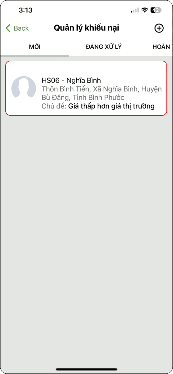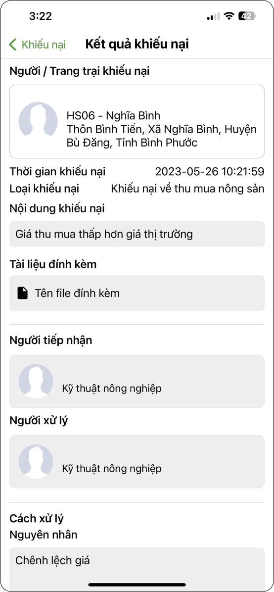Các khiếu nại được gửi đến bộ phận tiếp nhận của nhóm nông dân (Trạng thái mới) → Sau khi tiếp nhận được chuyển đến các đơn vị phụ trách xử lý tiếp nhận và tư vấn, thảo luận với nông hộ (Trạng thái Đang xử lý).