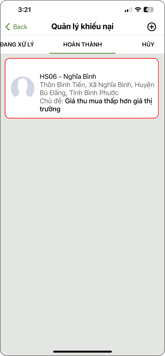 Hai bên thực hiện giải quyết khiếu nại đến khi đưa ra giải pháp xử lý và được sự đồng ý giữa hai bên → Báo cáo khiếu nại được kỹ thuật chuyển sang trạng thái hoàn thành (Hình 1) → Lưu kết quả khiếu nại và biện pháp xử lý. Nông hộ xem kết quả khiếu nại tại “Quản lý khiếu nại” → Hoàn thành
