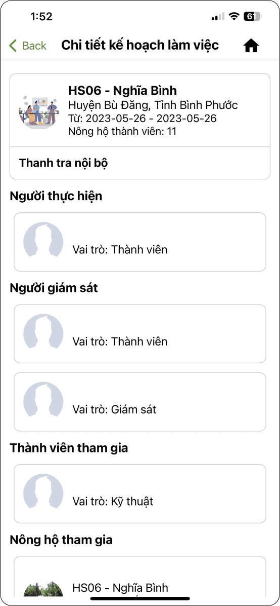 Trong mùa vụ canh tác, các lịch làm việc như: thanh tra nội bộ, đào tạo, khảo sát vùng trồng,.. Sẽ được ban quản lý nhóm tạo trên lịch làm việc, các trang trại có tham gia sẽ hiển thị trên danh sách lịch làm.