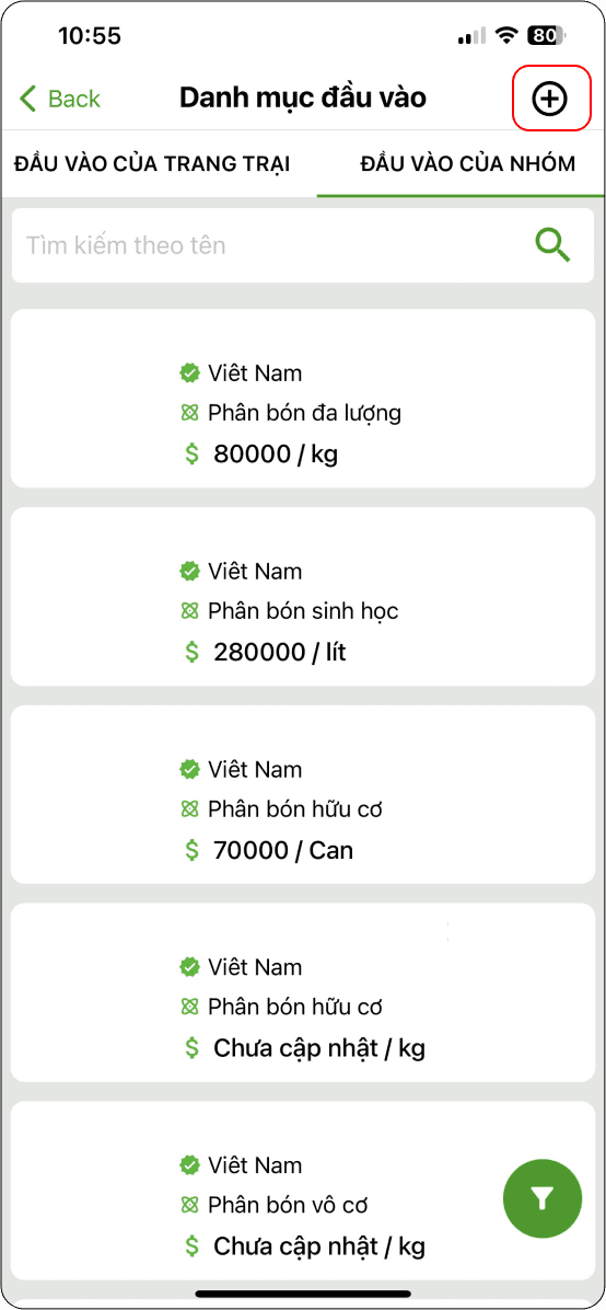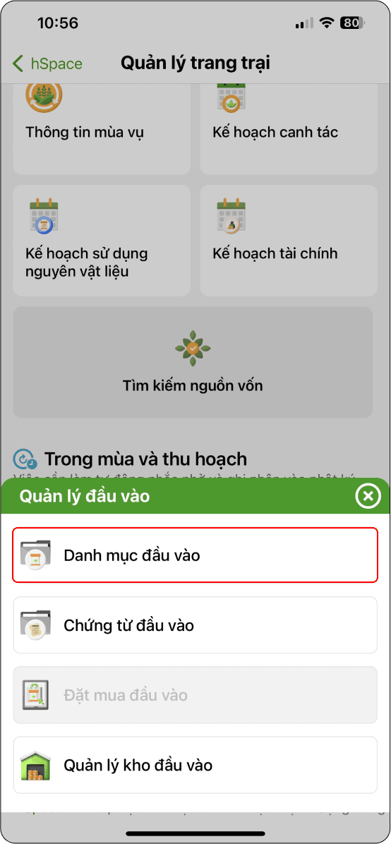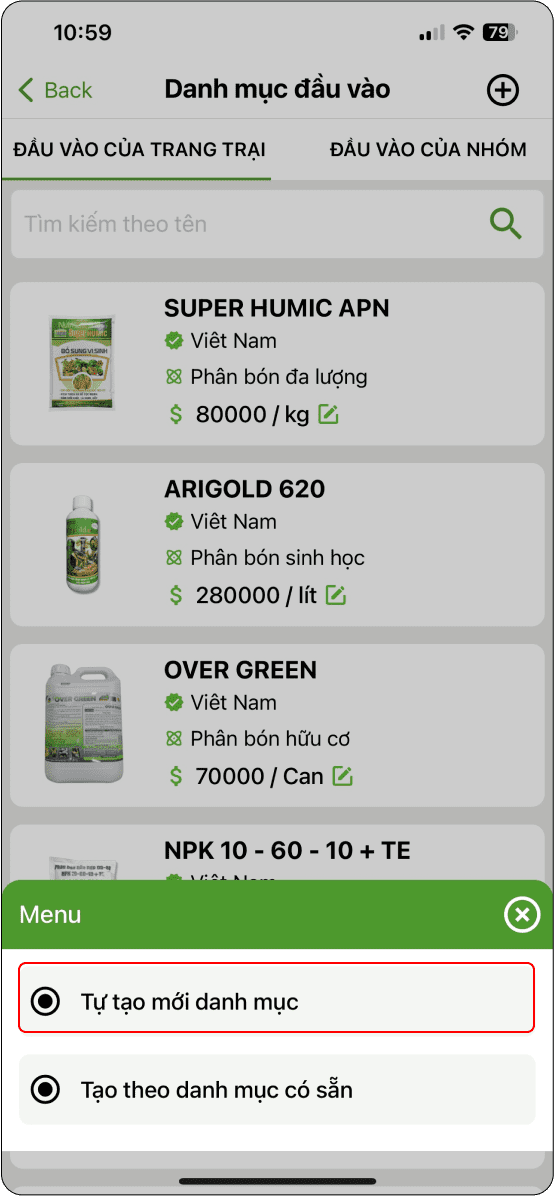 Nhấn vào “Quản lý đầu vào” (Hình 1) → nhấn vào “Danh mục đầu vào” (Hình 2) → nhấn vào “Đầu vào của nhóm” (Hình 3).