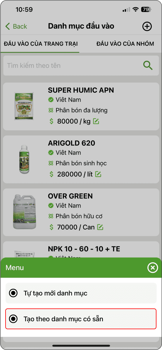 Chọn“Quản lý đầu vào” (Hình 1) → chọn “Danh mục đầu vào” (Hình 2) → Nhấn vào biểu tượng dấu “+” (Hình 3) → Nhấn vào “Tạo theo danh mục có sẵn” (Hình 4).