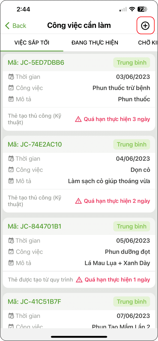 Trong quá trình canh tác, các công việc được thực hiện do ảnh hưởng yếu tố từ bên ngoài như: thời tiết, khí hậu,..., hệ thống cung cấp chức năng tạo công việc tại trang trại giúp khai báo công việc đột xuất hoặc phát sinh trong quá trình canh tác, công việc được tạo vẫn được lưu vào lịch sử canh tác và truy xuất nguồn gốc.