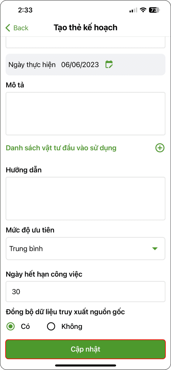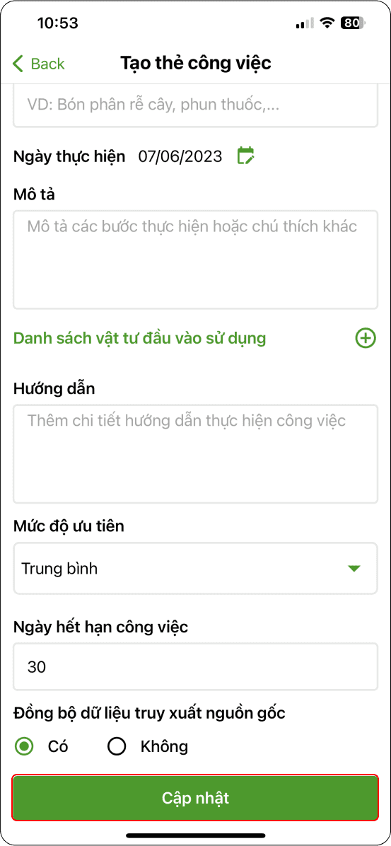 Truy cập “Việc cần làm tại trang trại” (Hình 1) → Chọn biểu tượng dấu “+” (Hình 2) → Nhập thông tin công việc theo yêu cầu (Hình 3) → Thêm danh sách vật tư (nếu có sử dụng) Cập nhật Vật tư → Cập nhật. Hoàn thành tạo thẻ giao việc (Hình 4).