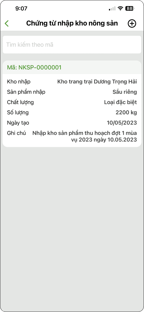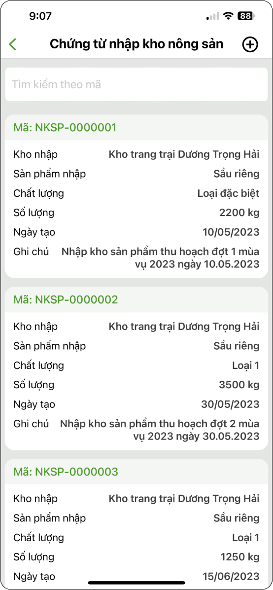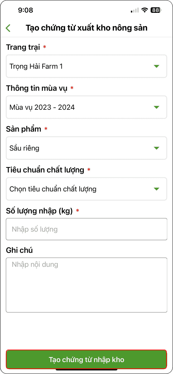 Sau mỗi đợt thu hoạch hoặc nhập kho nông sản, trang trại phải cập nhật chứng từ nhập kho nông sản trong kho nông sản của trang trại như sau: