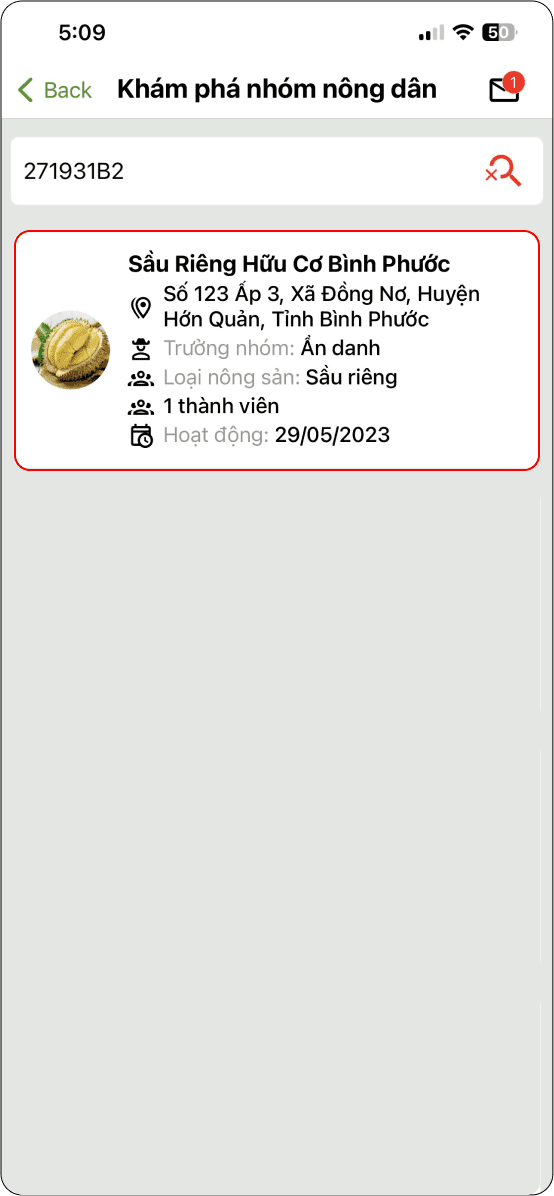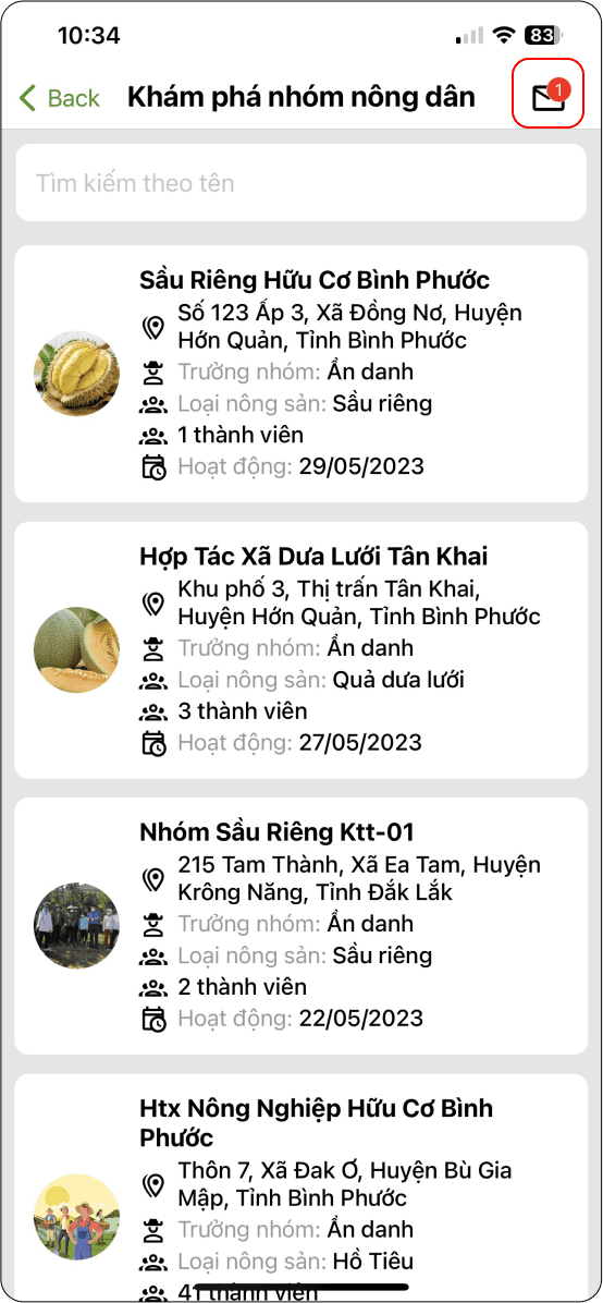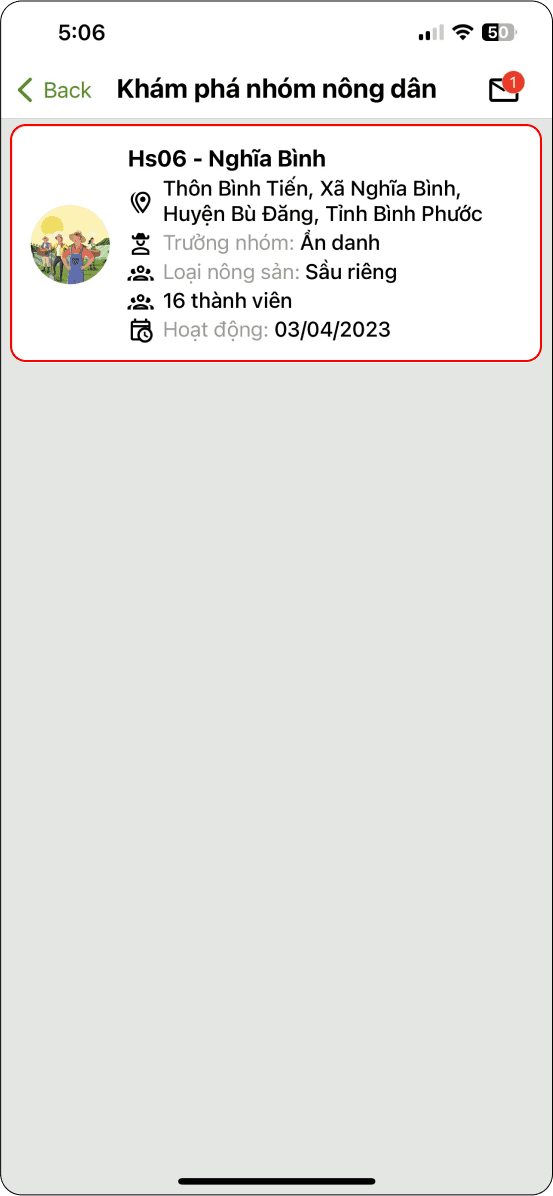 - Người dùng chọn phần nhắc nhở để truy cập khám phá nhóm (Hình 1) → Hiển thị danh sách nhóm nông dân (Hình 2).Nếu nông hộ chưa tham gia nhóm liên kết nào và không có người giới thiệu, nông hộ đăng ký tham gia vào nhóm liên kết cơ sở hStartup tại địa phương, tại nhóm này người dân tự khai báo và thực hiện canh tác và được nhận hỗ trợ từ các kỹ thuật trong nhóm tại địa phương. Sau quá trình canh tác, ban quản lý nhóm có thể chuyển nông hộ đến nhóm liên kết nông hộ để canh tác theo tiêu chuẩn, hỗ trợ trong quá trình canh tác,...