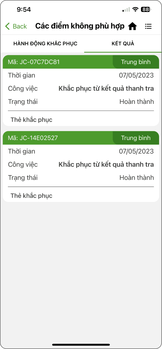 - Nếu đạt điều kiện → Kết quả thực hiện được lưu lại → Thẻ công việc được kỹ thuật chuyển sang trạng thái hoàn thành