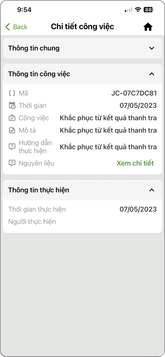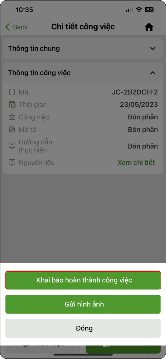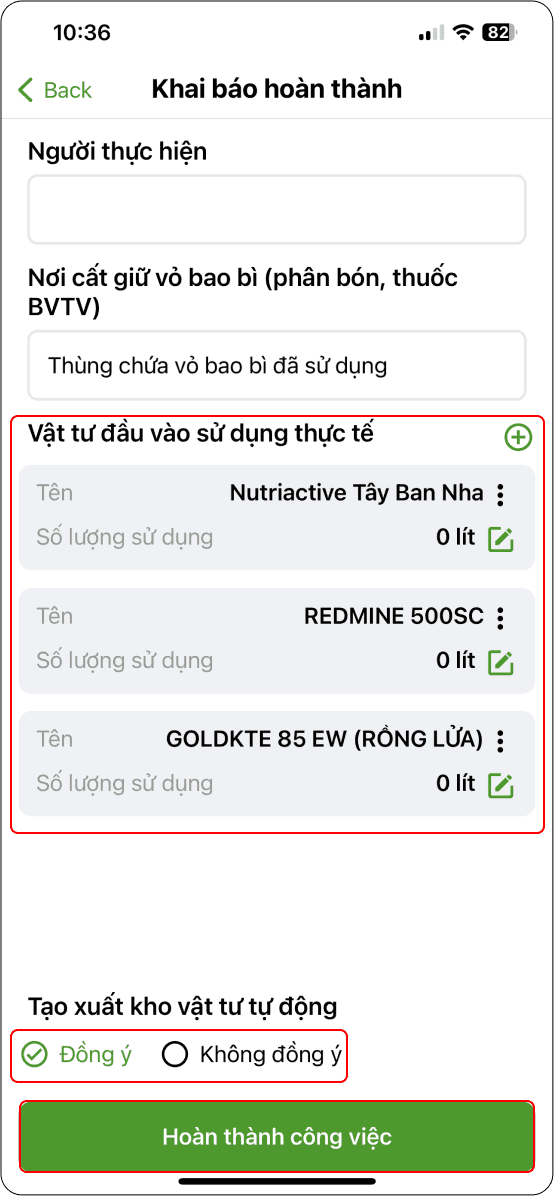 - Trường hợp công việc không sử dụng vật tư đầu vào →bước xác nhận hoàn thành công việc.