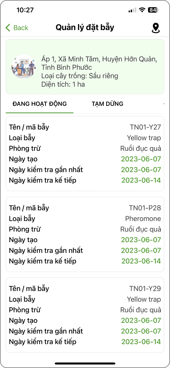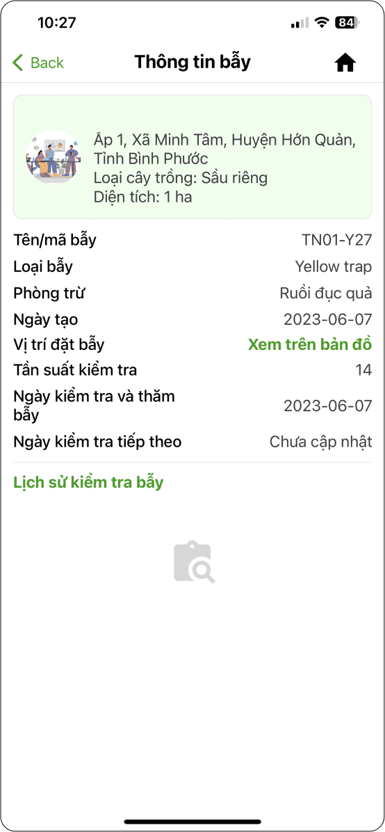 → Chọn vào bẫy để xem chi tiết thông tin và lịch sử kiểm tra của bẫy (Hình 4). Lịch sử kiểm tra bẫy sẽ được lưu lại và là thông tin nhật ký sinh vật gây hại của trang trại.