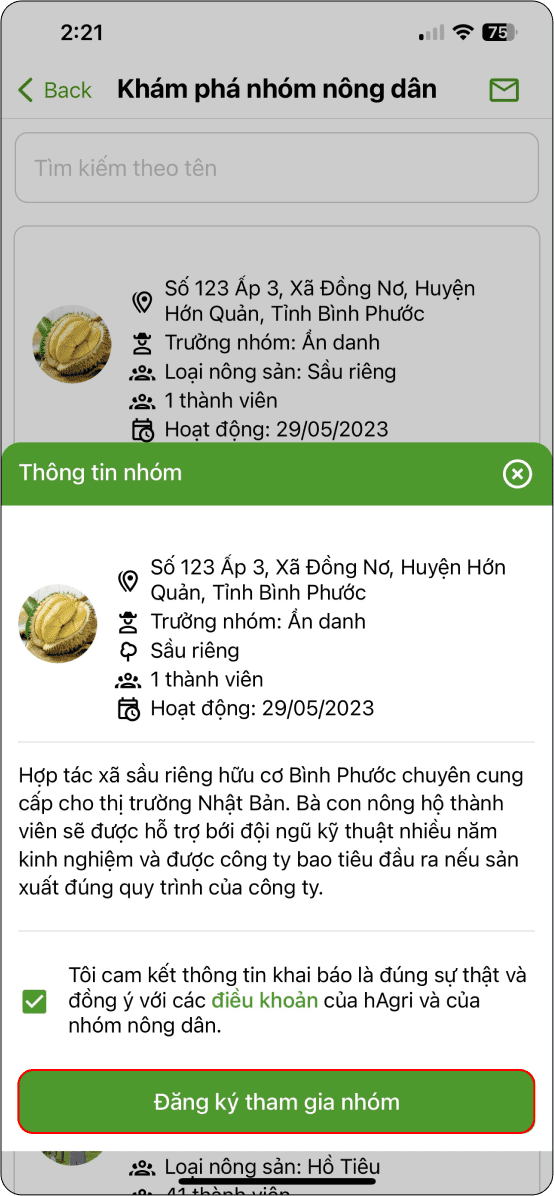 Nông hộ chọn vào nhóm hiển thị trên danh sách → Chọn vào nhóm đã tìm kiếm (Hình 1) → Xác nhận cam kết thông tin (Hình 2) → Đăng ký tham gia nhóm (Hình 2).