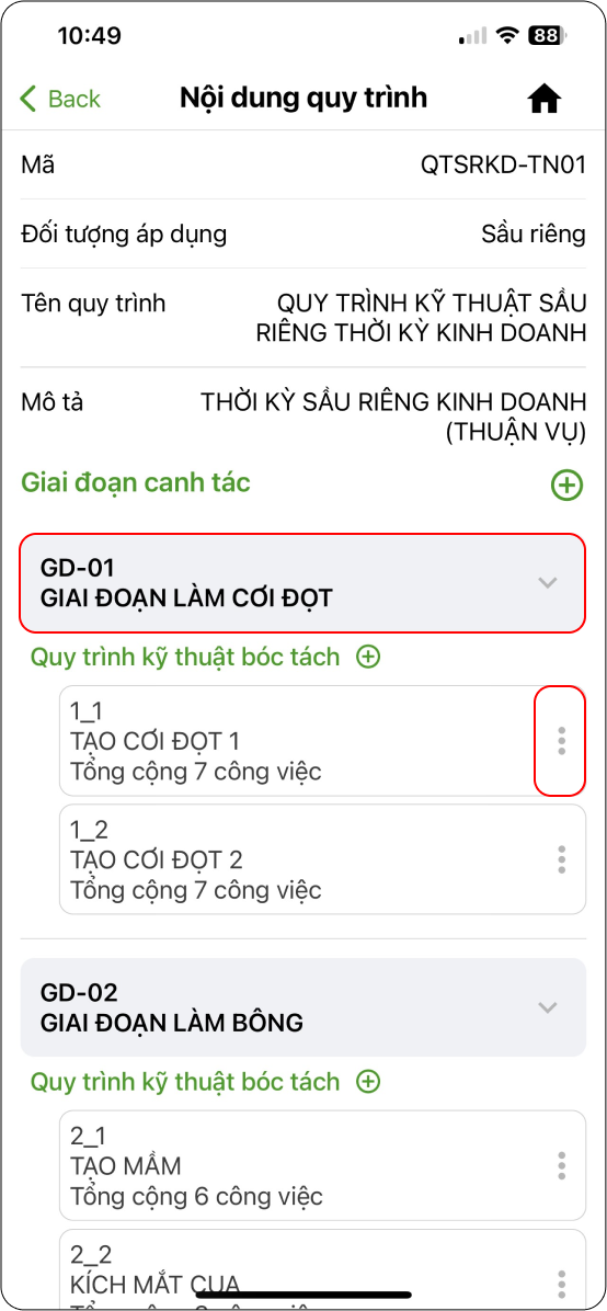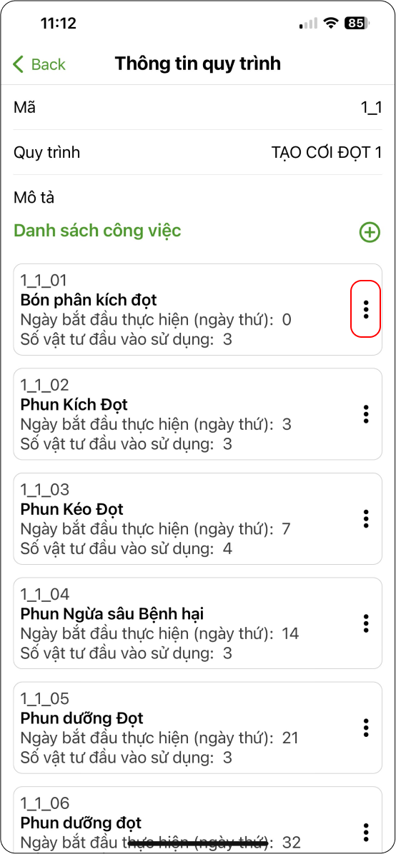 B3 - B4: Tại màn hình “Danh sách quy trình kỹ thuật” → Chọn quy trình muốn điều chỉnh (Hình 4 của B2) → Truy cập vào giai đoạn hoặc công việc muốn điều chỉnh (Hình 1) → Chọn biểu tượng ba chấm hoặc ấn giữ (Hình 2) → Chọn “Chỉnh sửa” (Hình 3).